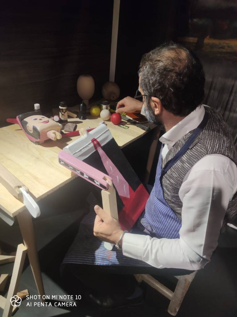 Aziz Saydut, oyunda Gepetto ustaya hayat vermekte. Hikâye anlatıcı olan Aziz Saydut akıcı ve tasvir dili ile oyunda, Pinokyo ya masallar anlatıyor.